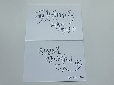 안녕하세요 저는 지금 인생의 전환점을 맞게되어 여기저기 교육받다가 우연히 책을 보고 가입하게 되었는데 다른데와는 다르게 허경수 대표님의 매직셀러의 진정성과 열정반해 감탄햇고요 앞으로도 매직셀러들분의 소중하고 좋은 만남을 기대합니다 앞으로도 잘부탁드립니다